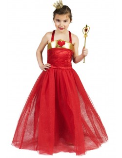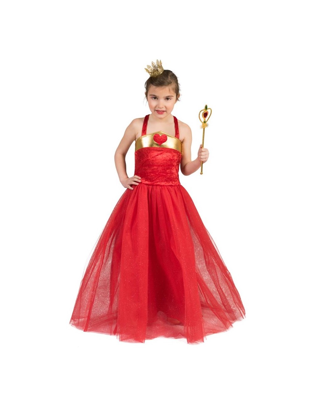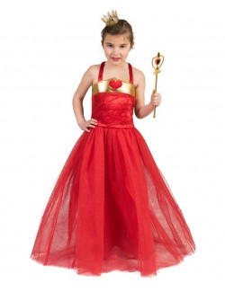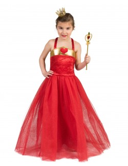 Rochie rosie, cu bretele incrucisate pe spate, confectionata din tul si catifea rosie cu finisaje aurii, creata special pentru roluri de printesa, Regina inimilor sau orice alta ocazie, material 100% poliester.