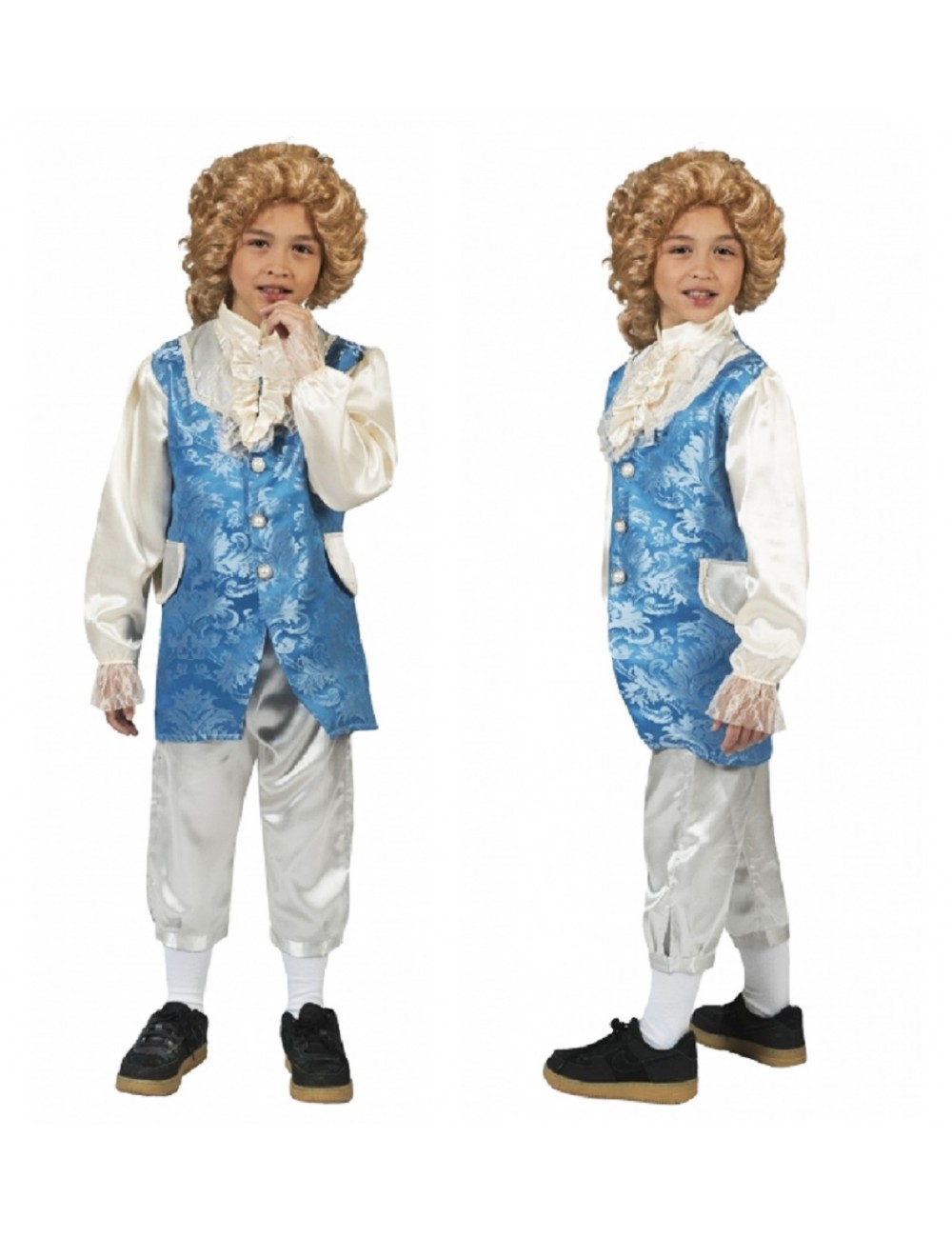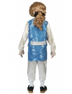 Costum epoca, Micul Marchiz, pentru copii, contine pantaloni 3/4 din satin bej si jacheta cu maneca lunga, din brocart albastru si tesatura satin ecru, accesorizata cu dantela, 100% poliester.