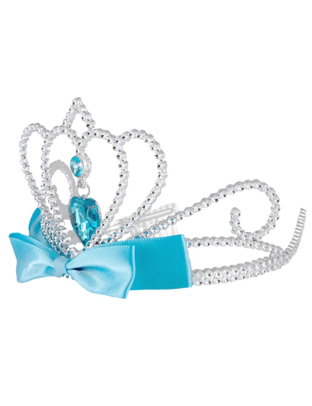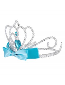 Diadema argintie cu fundita bleu, din plastic argintiu, accesorizata cu pietre si fundita bleu, perfecta pentru completarea tinutei de Printesa.
