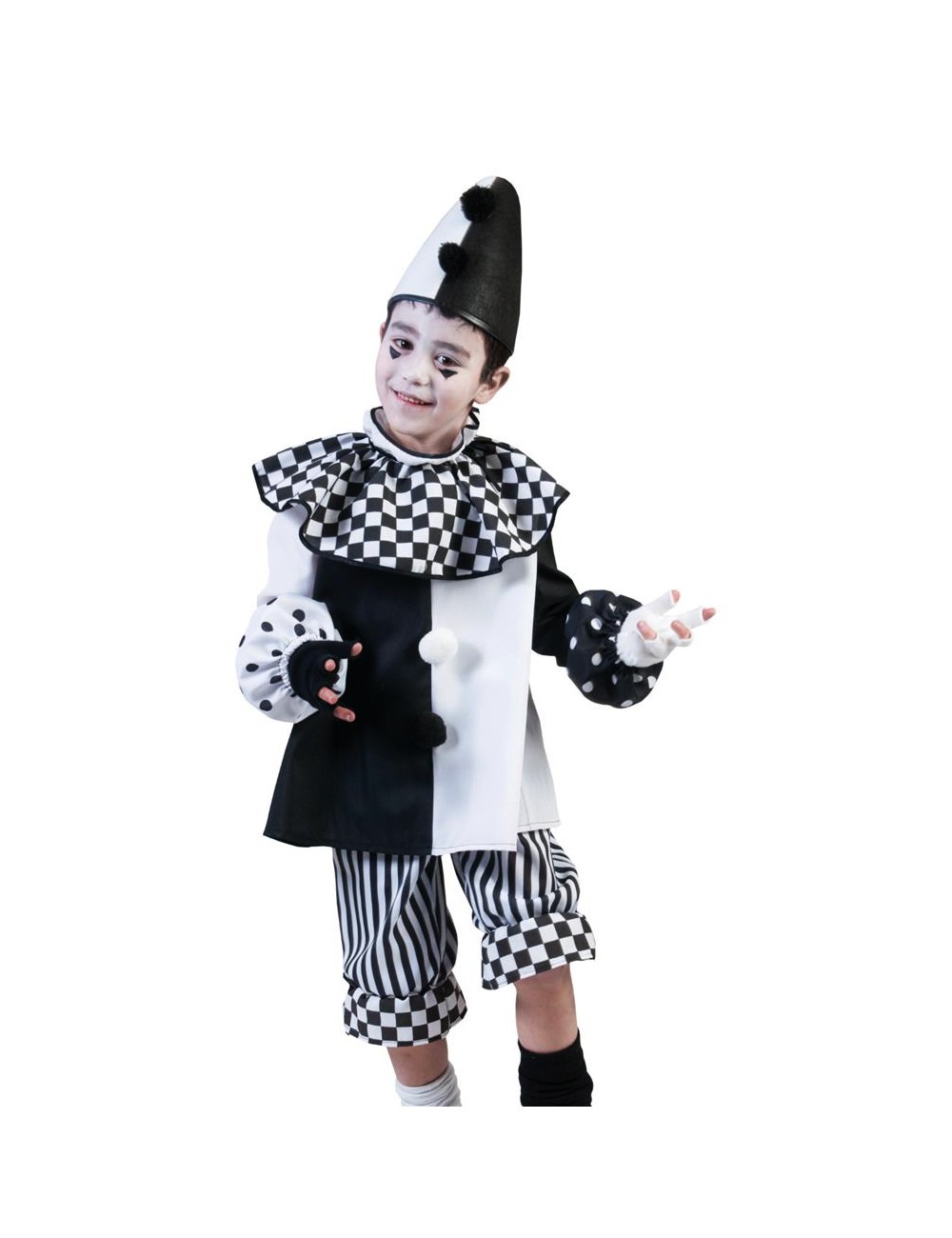 Costum Arlechin - Pierrot, pentru copii, contine pantaloni pana la genunchi si jacheta cu maneca lunga, culori alb-negru, 100% poliester.