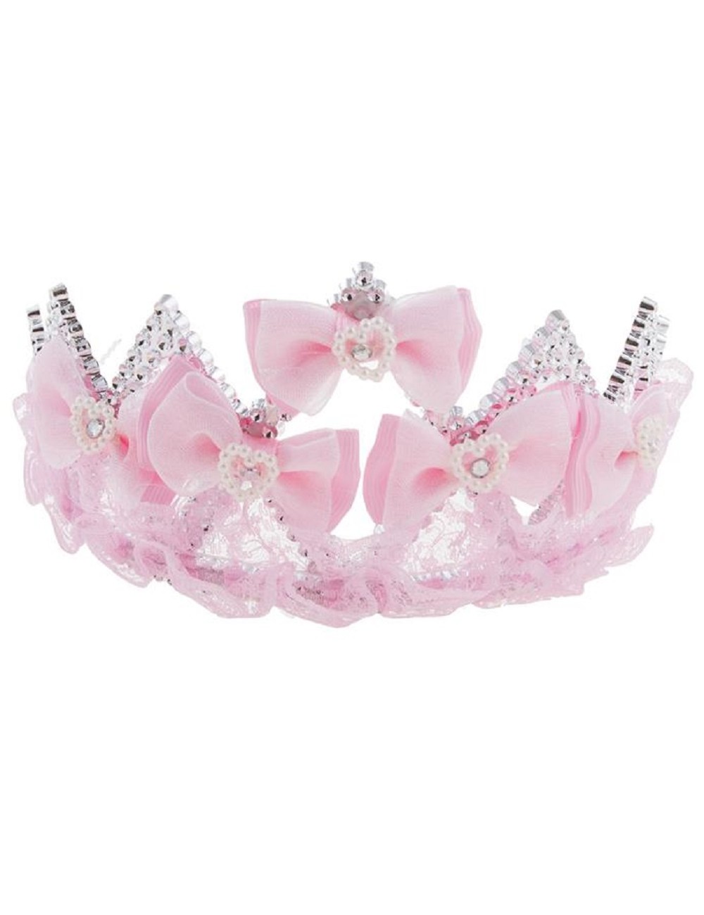 Diadema argintie cu fundite roz, accesorizata cu pietre si perlute albe, din plastic, perfecta pentru completarea tinutei unei Printese.