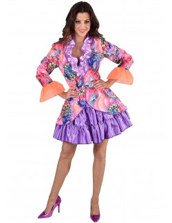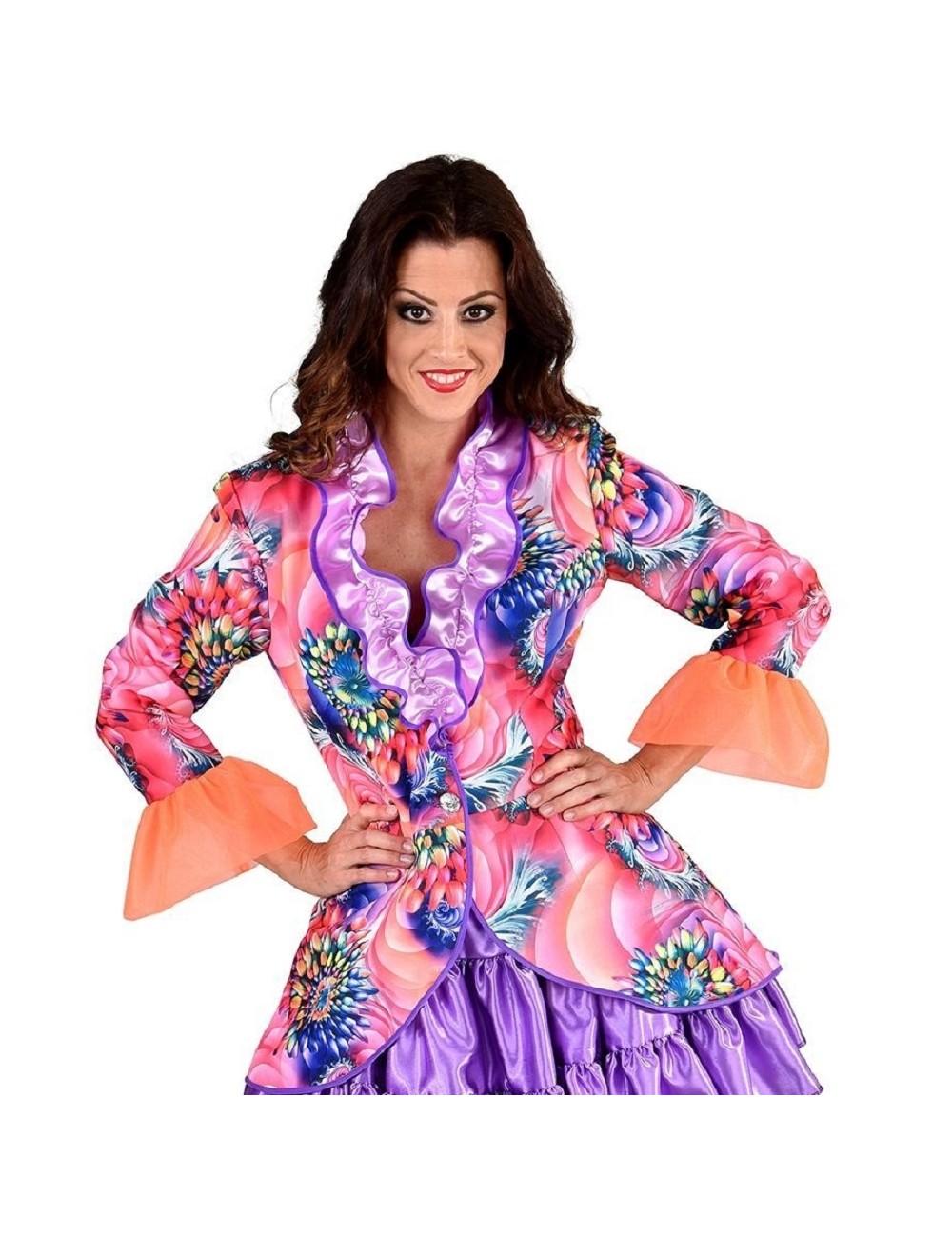 Jacheta Summer Love, pentru femei, maneci cu volane din tul portocaliu, imprimeu floral multicolor, guler din satin mov-lila, material 100% poliester, inchidere cu nasturi.