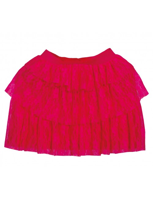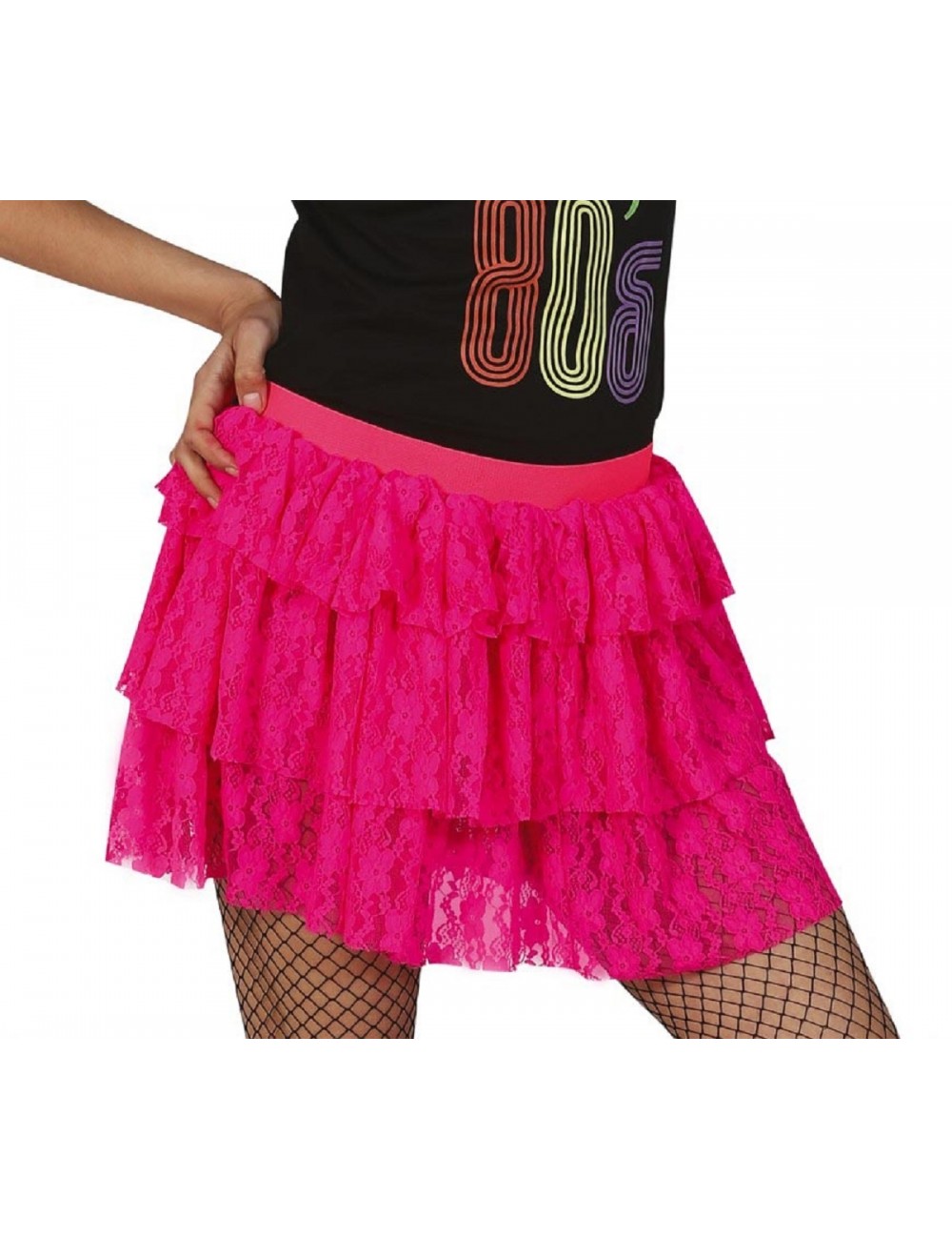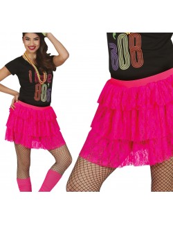 Fusta roz-neon, cu volane din dantela - 100% poliester, are elastic lat in talie, potrivita pentru serbari si carnaval, inspirata din vestimentatia anilor'80.
