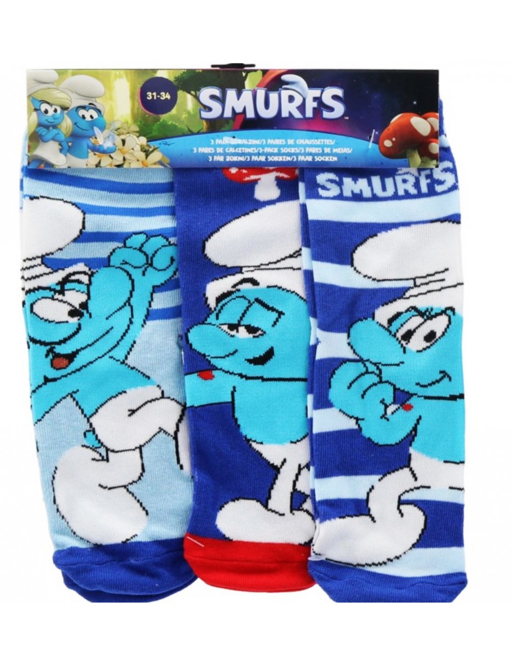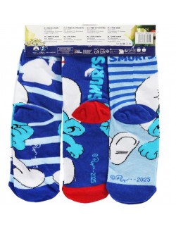Set 3 perechi sosete, Strumfi, albastre, marimi 23-34, imprimeuri diferite, compozitie material 60% bumbac, 37% poliester, 3% elastan.